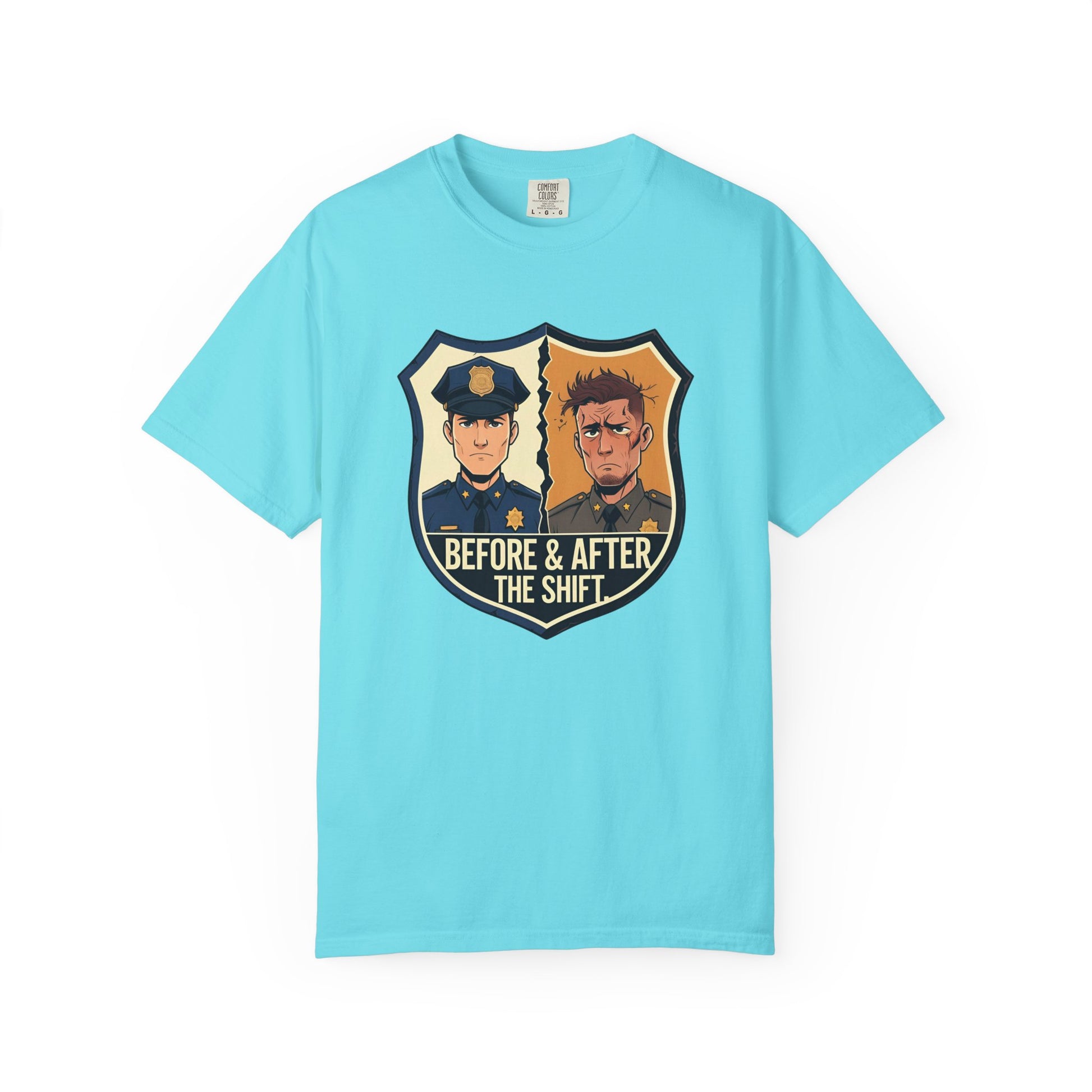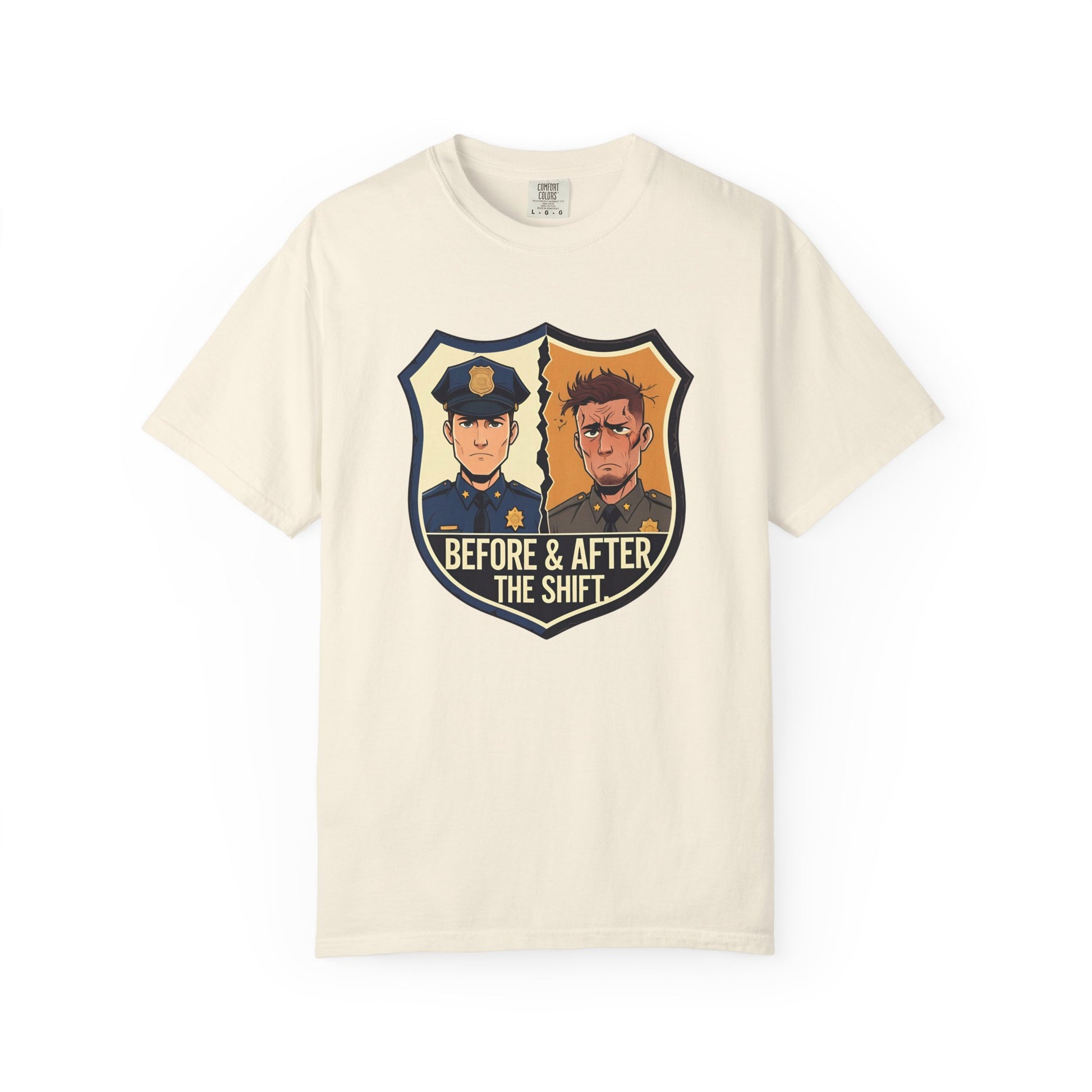 Beneath it all, the phrase “Before & After The Shift” in cracked serif text tells a story most cops don’t even need to explain. It’s humorous, brutally honest, and just plain relatable.