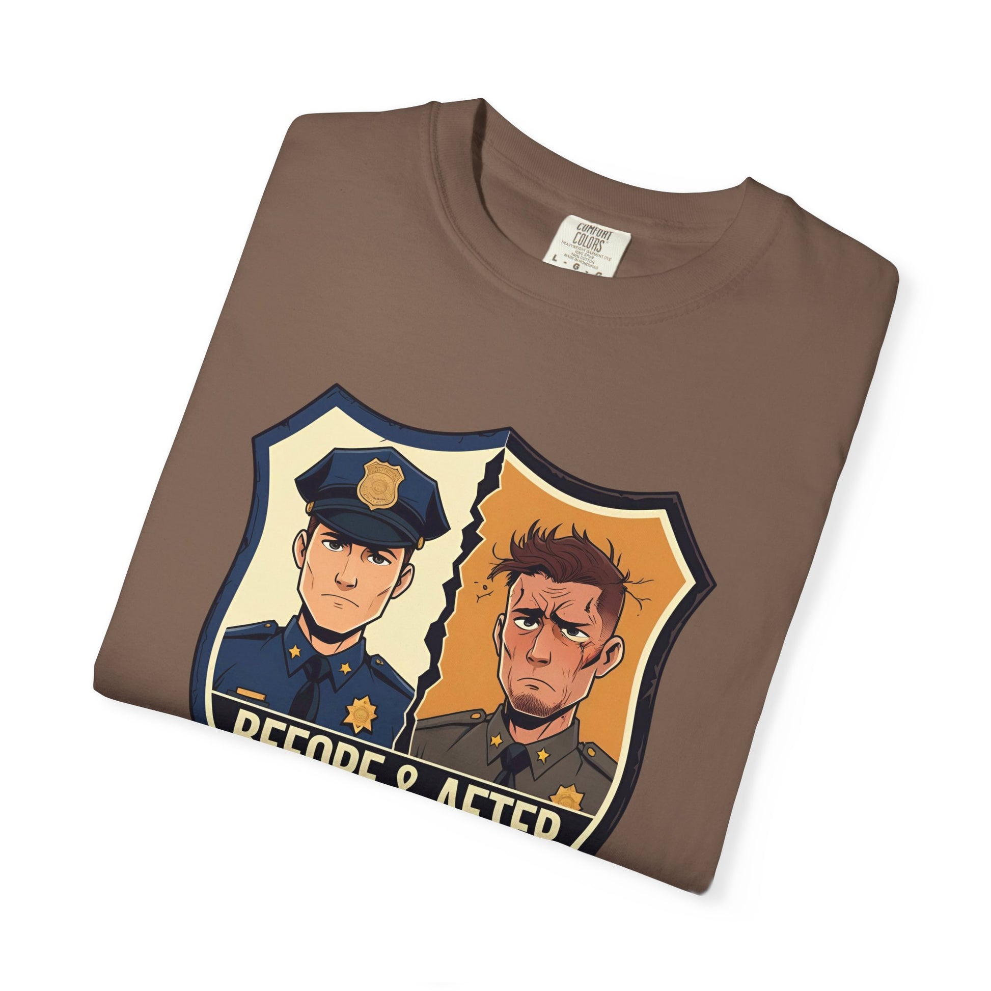This graphic tee captures the raw reality of law enforcement with a sharp badge-shaped design split down the middle. On the left: a polished, cartoon-style depiction of an idealistic officer, gear squared, smile beaming. On the right: a frazzled, disheveled mirror image with a 1,000-yard stare and the weight of the world on their shoulders.