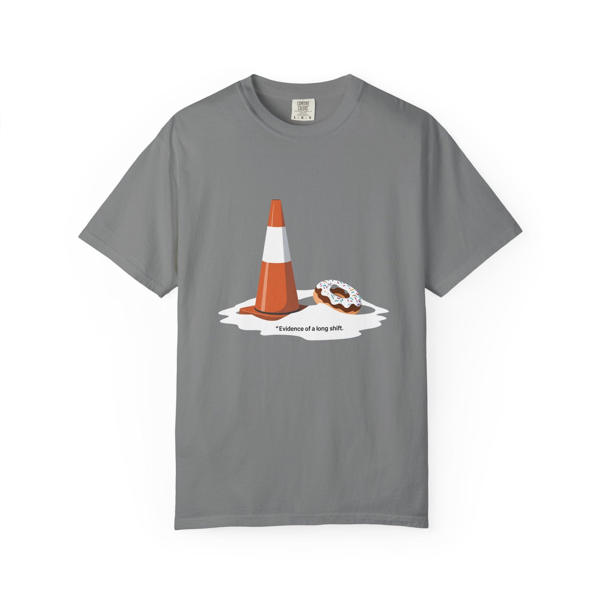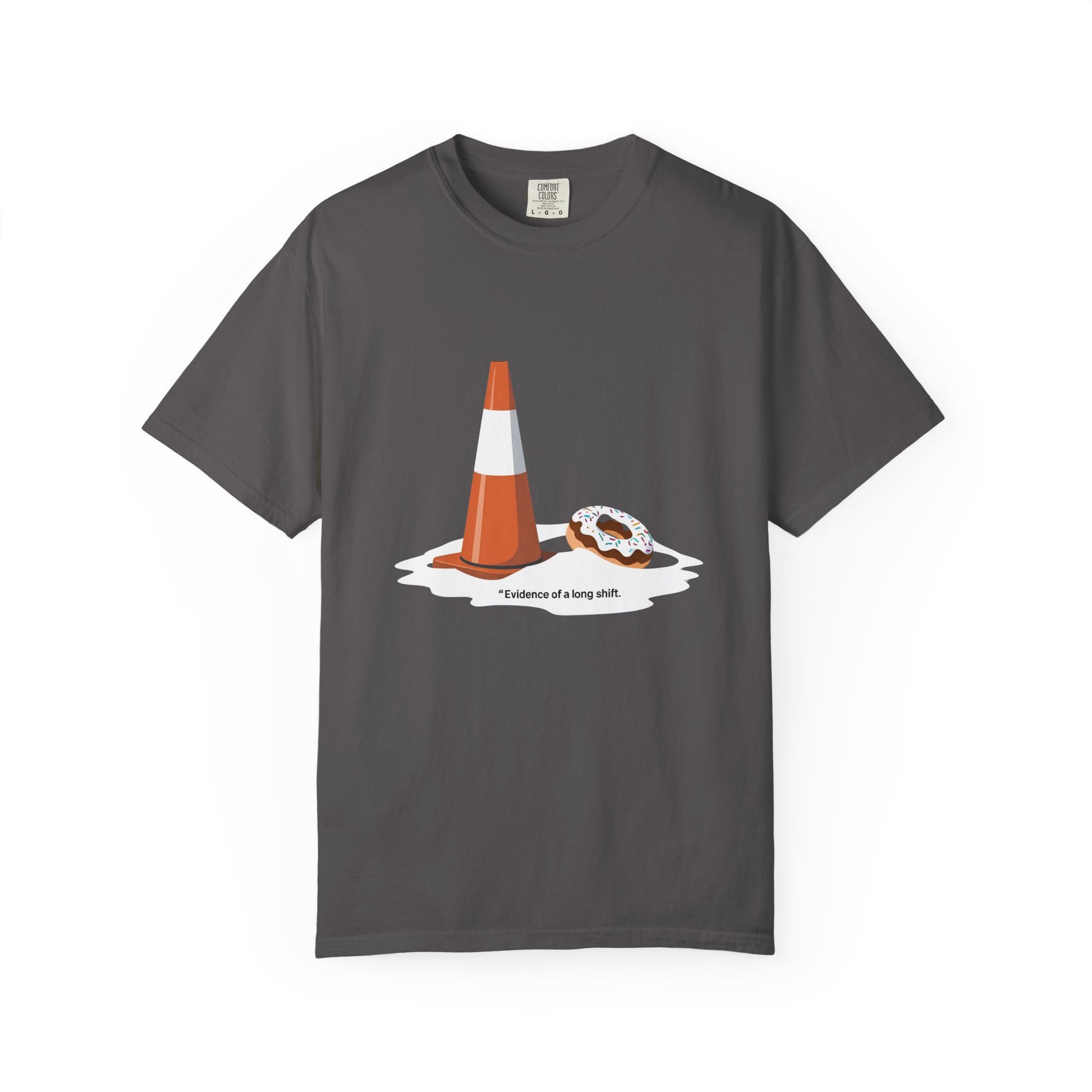 This minimalist tee captures the silent story every cop recognizes—an abandoned parking cone, a half-buried donut, and the aftermath of one hell of a shift. With an off-center, asymmetrical layout, the scene is equal parts hilarious and heartbreaking.