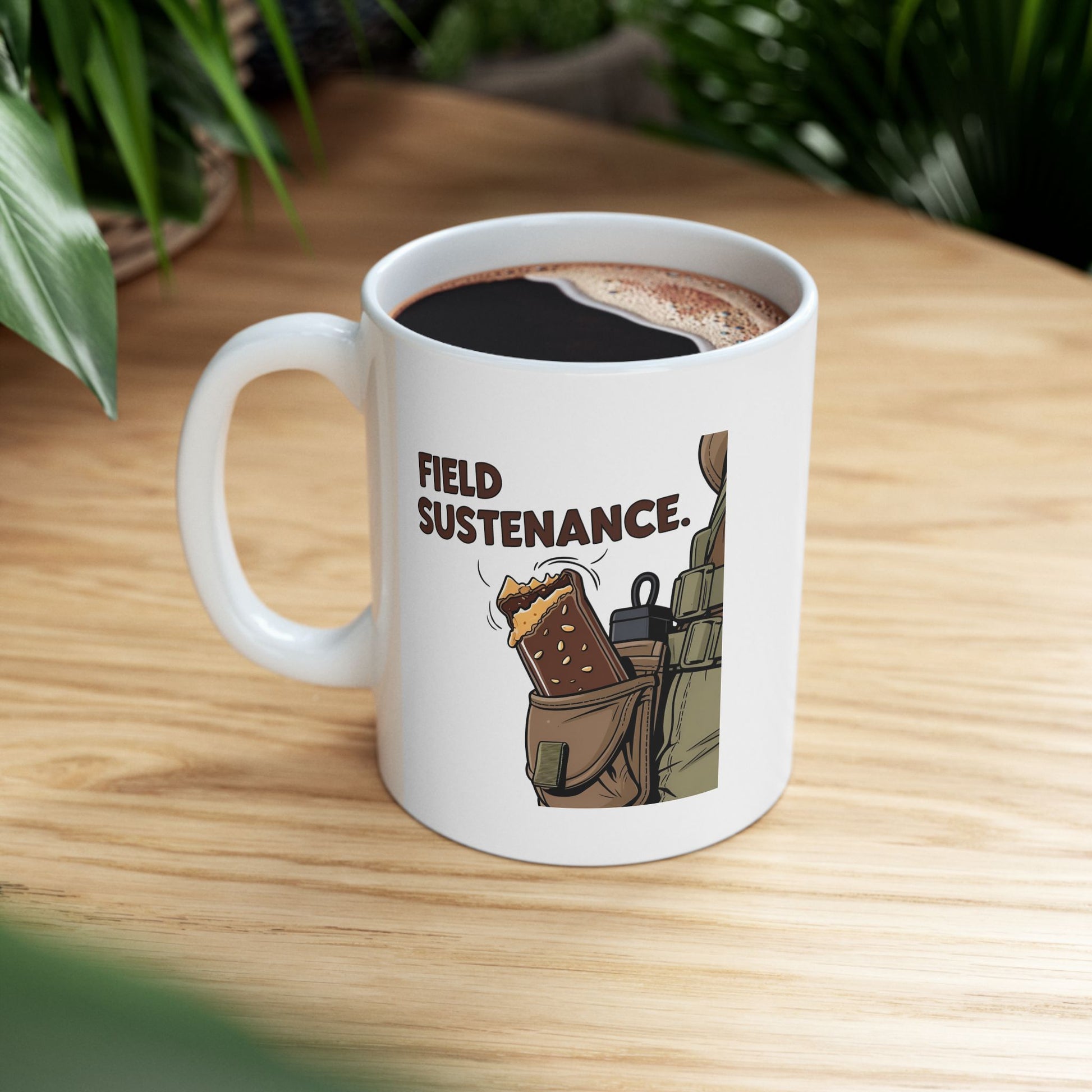 This mug captures a hard truth of the job: meals happen when—and where—they can. Featuring a cartoon-style illustration of a half-eaten energy bar stuffed in a duty belt pouch, topped with the bold phrase “Field Sustenance” in sarcastic serif font, this design salutes the snack-based survival tactics of shift life.