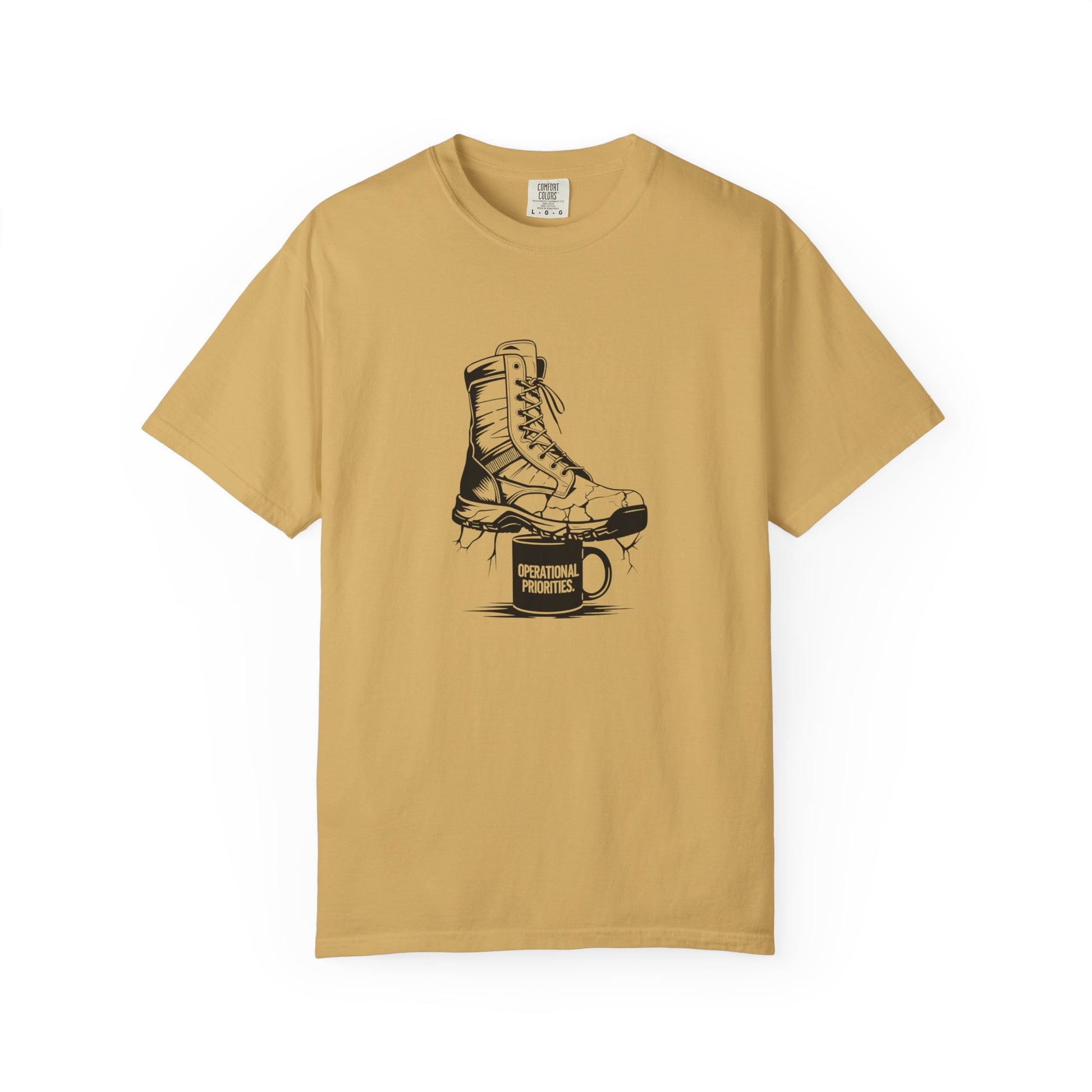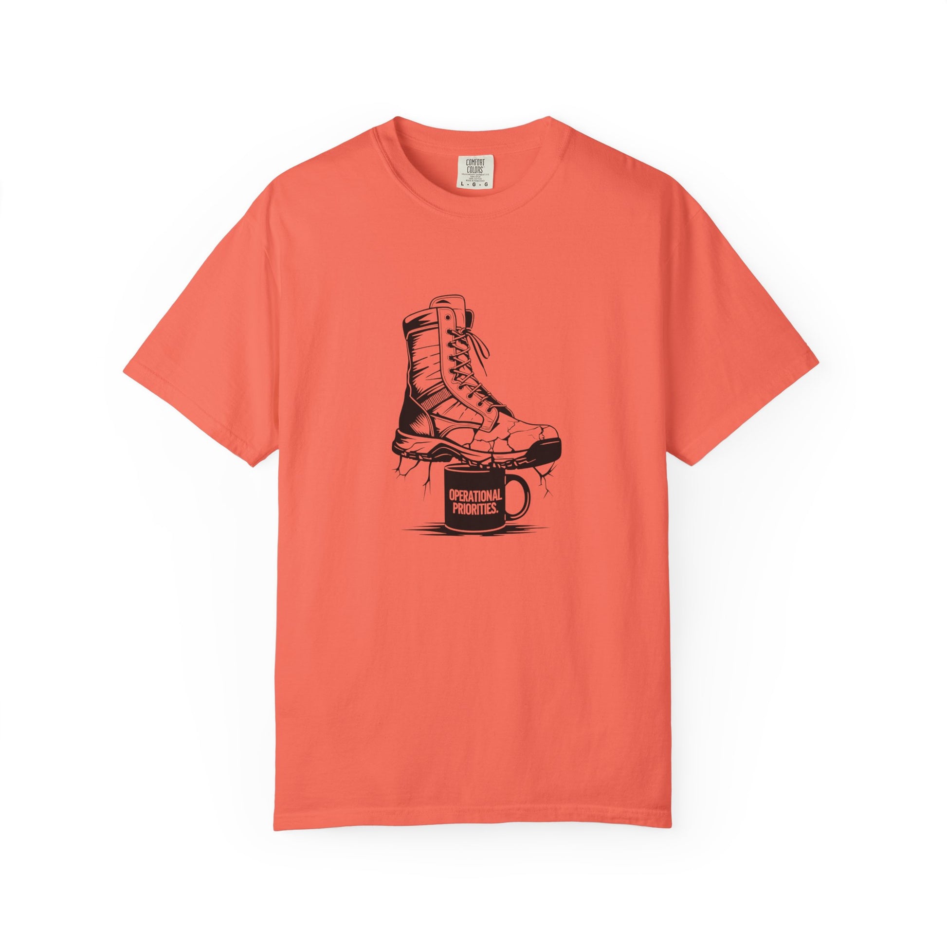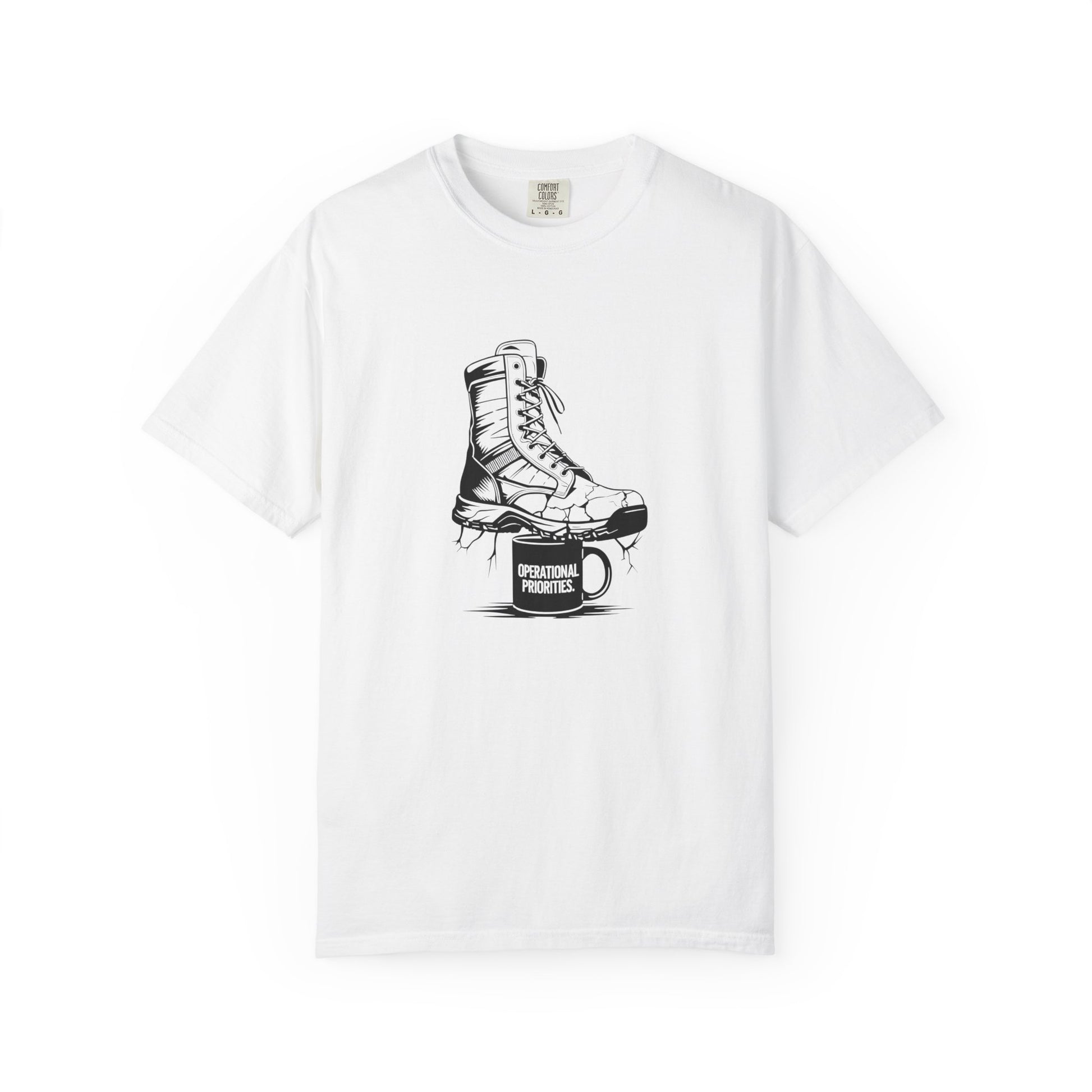This Salty Sgt exclusive tee features a minimalist outline of a cracked patrol boot stepping squarely on a coffee cup—an all-too-familiar symbol of what gets crushed when duty calls. The bold, tactical-style text “Operational Priorities” drives home the message with a side of sarcasm.