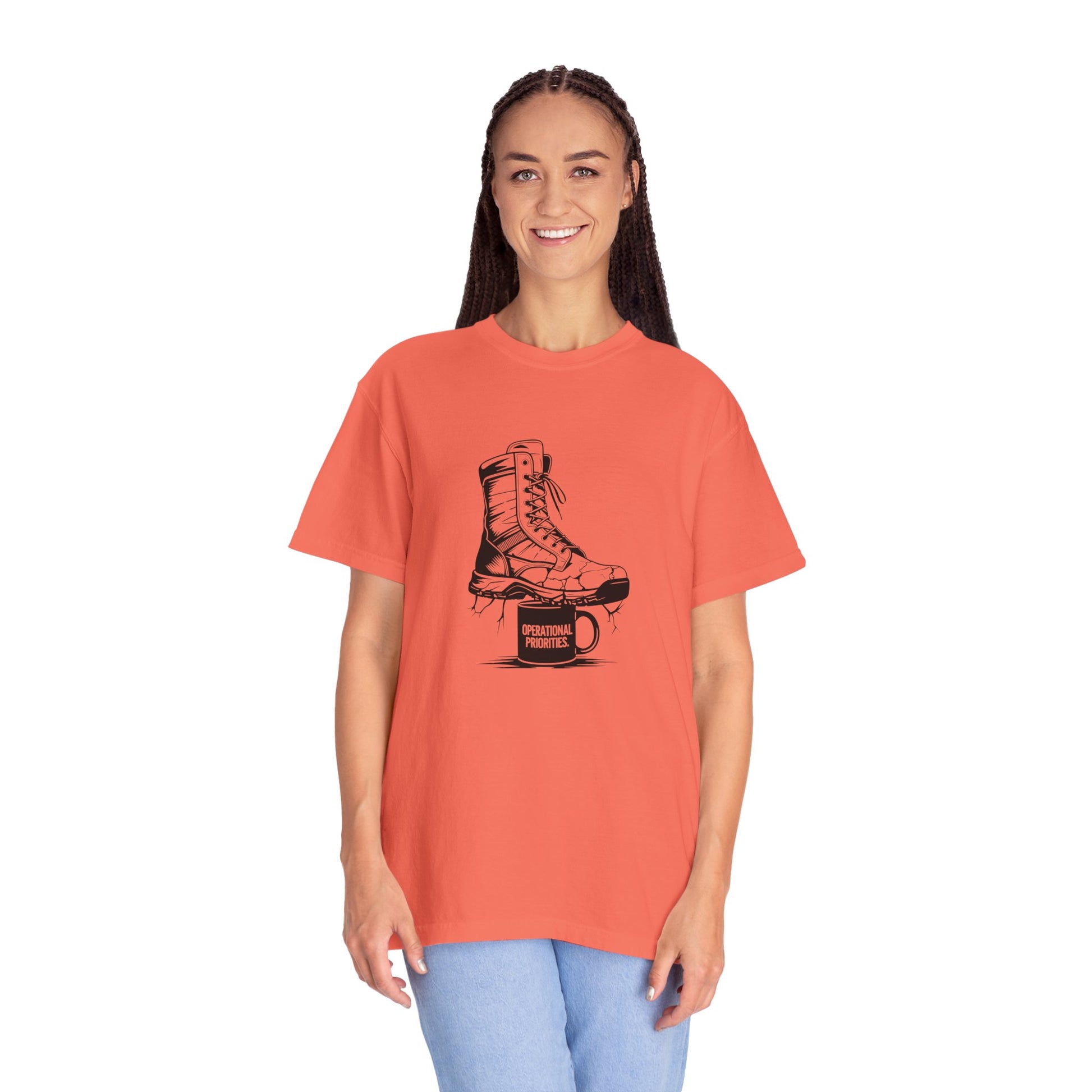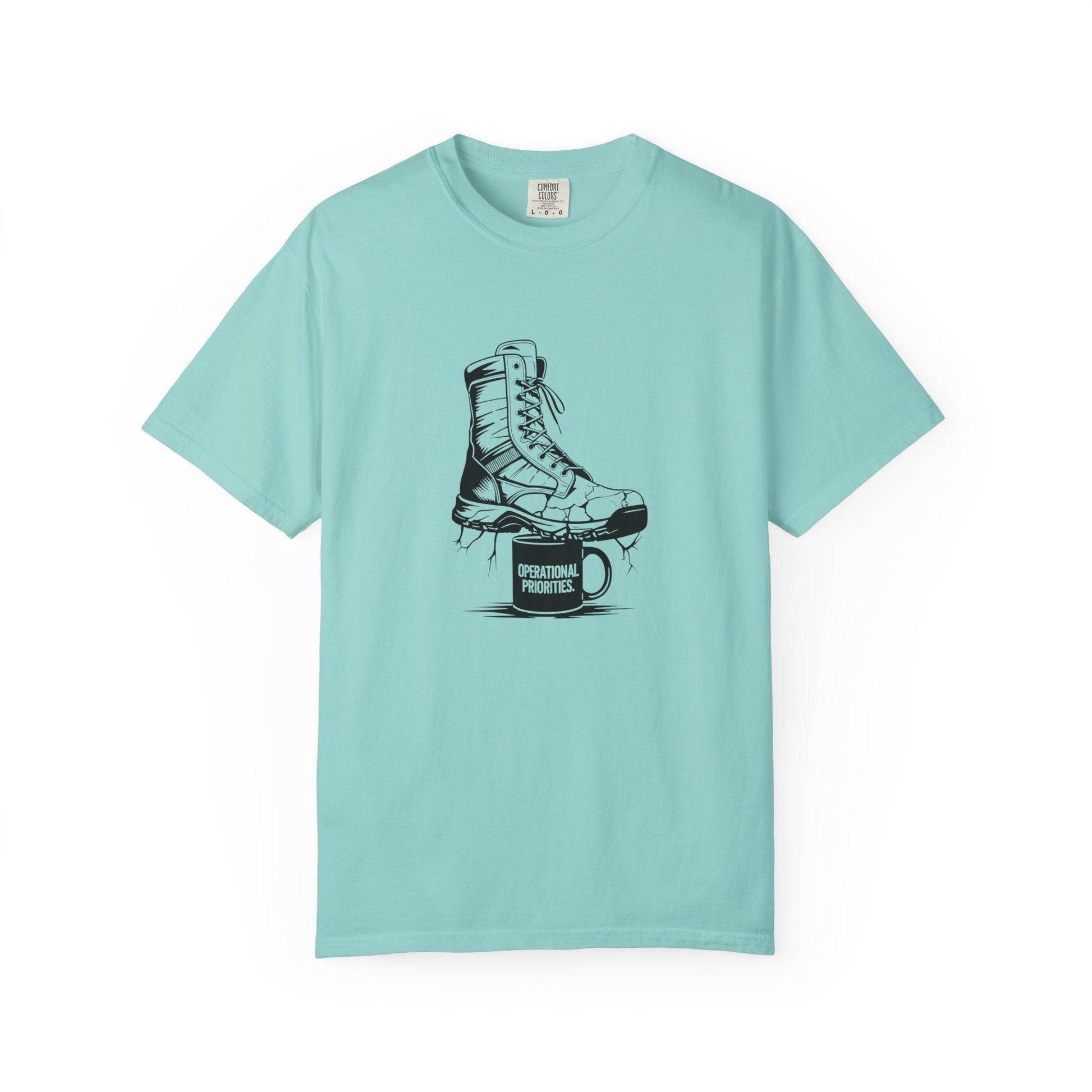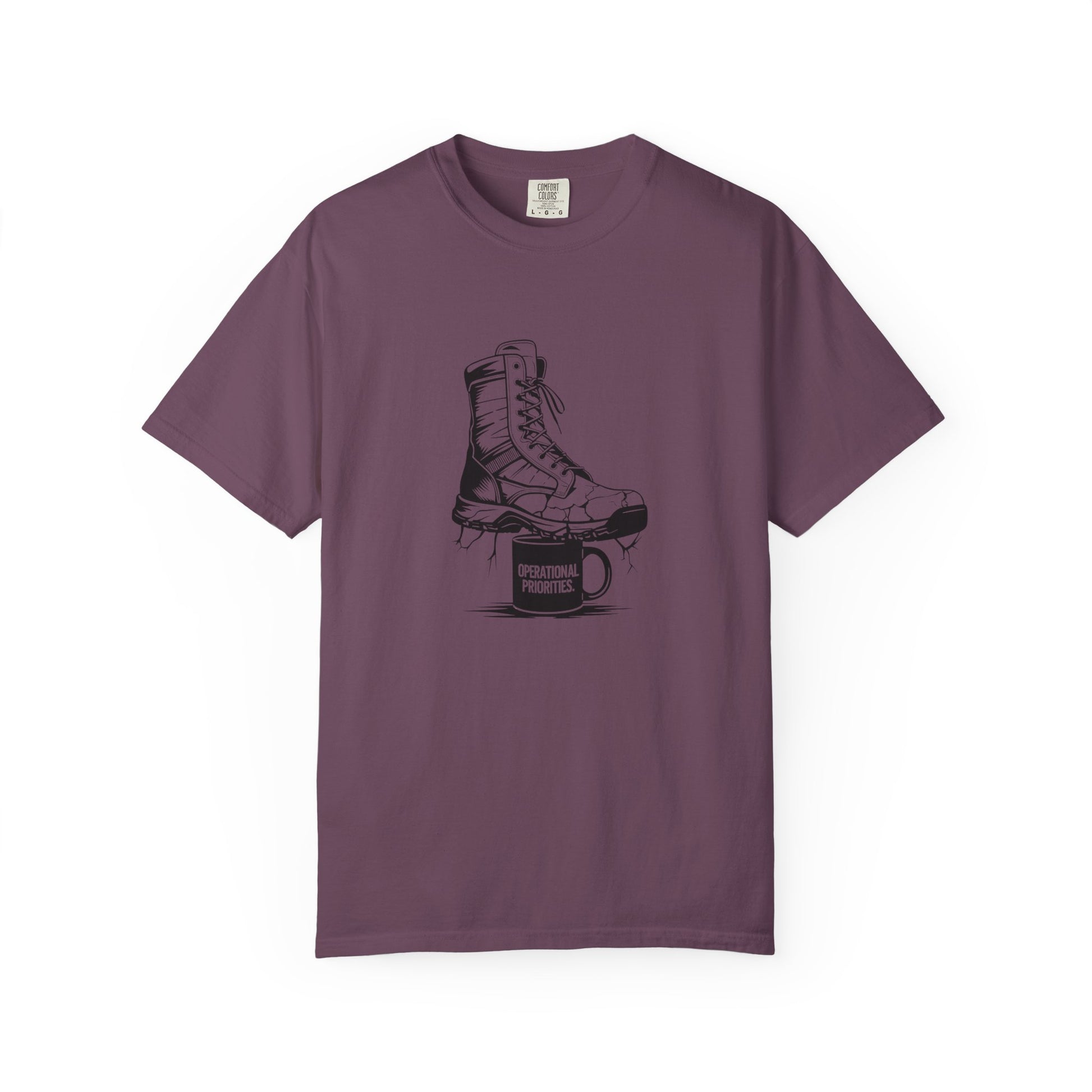This Salty Sgt exclusive tee features a minimalist outline of a cracked patrol boot stepping squarely on a coffee cup—an all-too-familiar symbol of what gets crushed when duty calls. The bold, tactical-style text “Operational Priorities” drives home the message with a side of sarcasm.