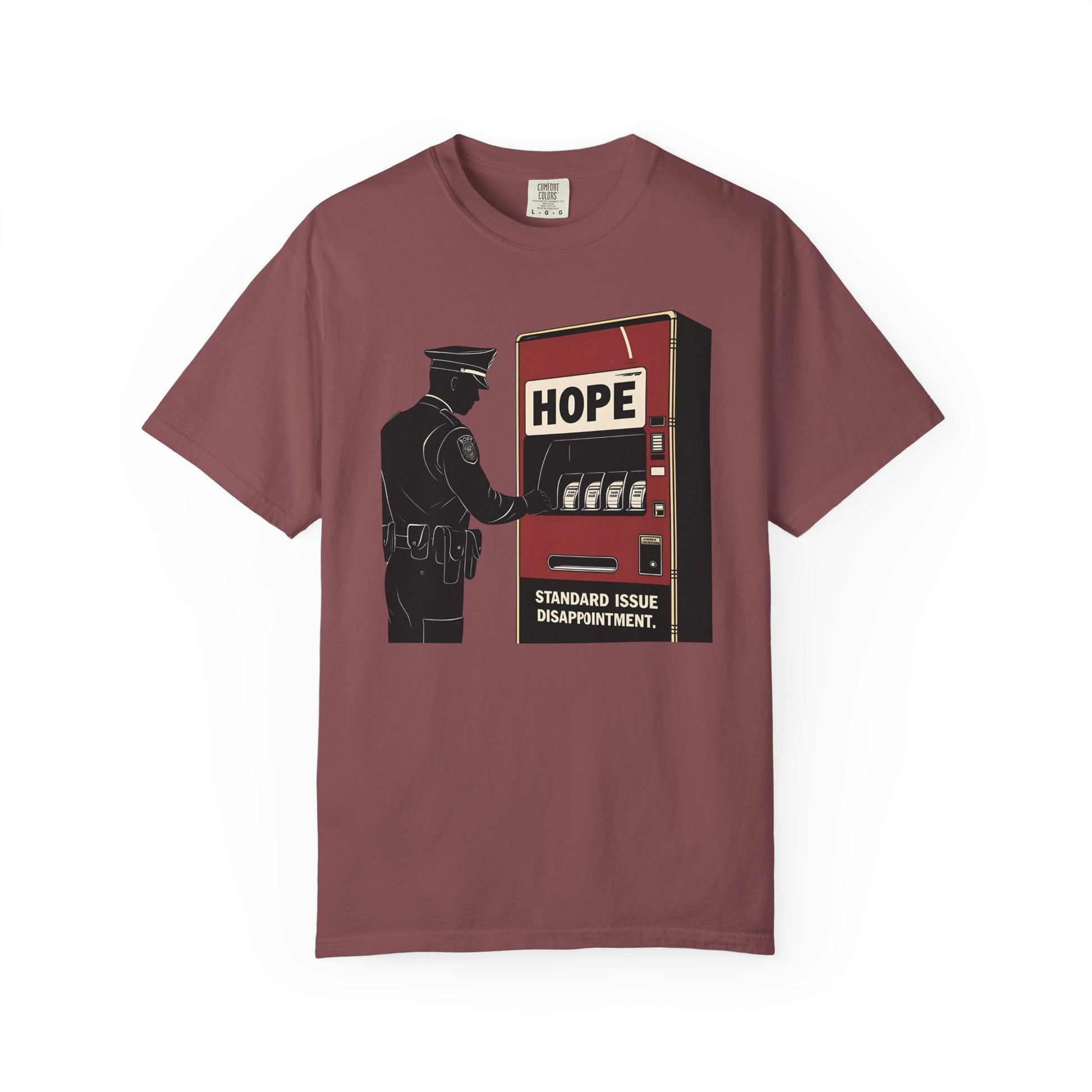 This gritty graphic tee captures the dry humor of life in uniform. Featuring the silhouette of a weary officer staring into an empty vending machine labeled "Hope," this shirt speaks for every shift that ended with more sighs than snacks. Below the scene, bold, all-caps text hits hard: "Standard Issue Disappointment."